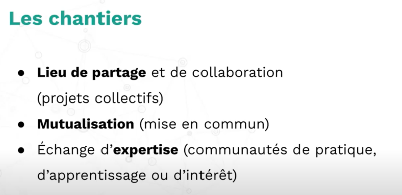 Les chantiers de la communauté de pratique ont été créé en 2019. Ils avaient trois objectifs : devenir des lieux de partage et de collaboration, encourager la mise en commun et favoriser les échanges d'expertise.