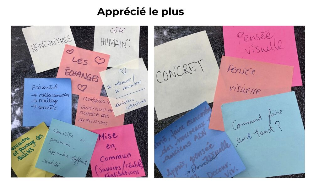 Le simple fait de se réunir et d'échanger en personne lors de la Rencontre nationale crée une véritable magie! Voici ce qui a particulièrement plu aux ADN, ce qu'iels retiennent, et les actions prioritaires qu'iels envisagent de mettre en œuvre en lien avec certains apprentissages au cours des semaines à venir.